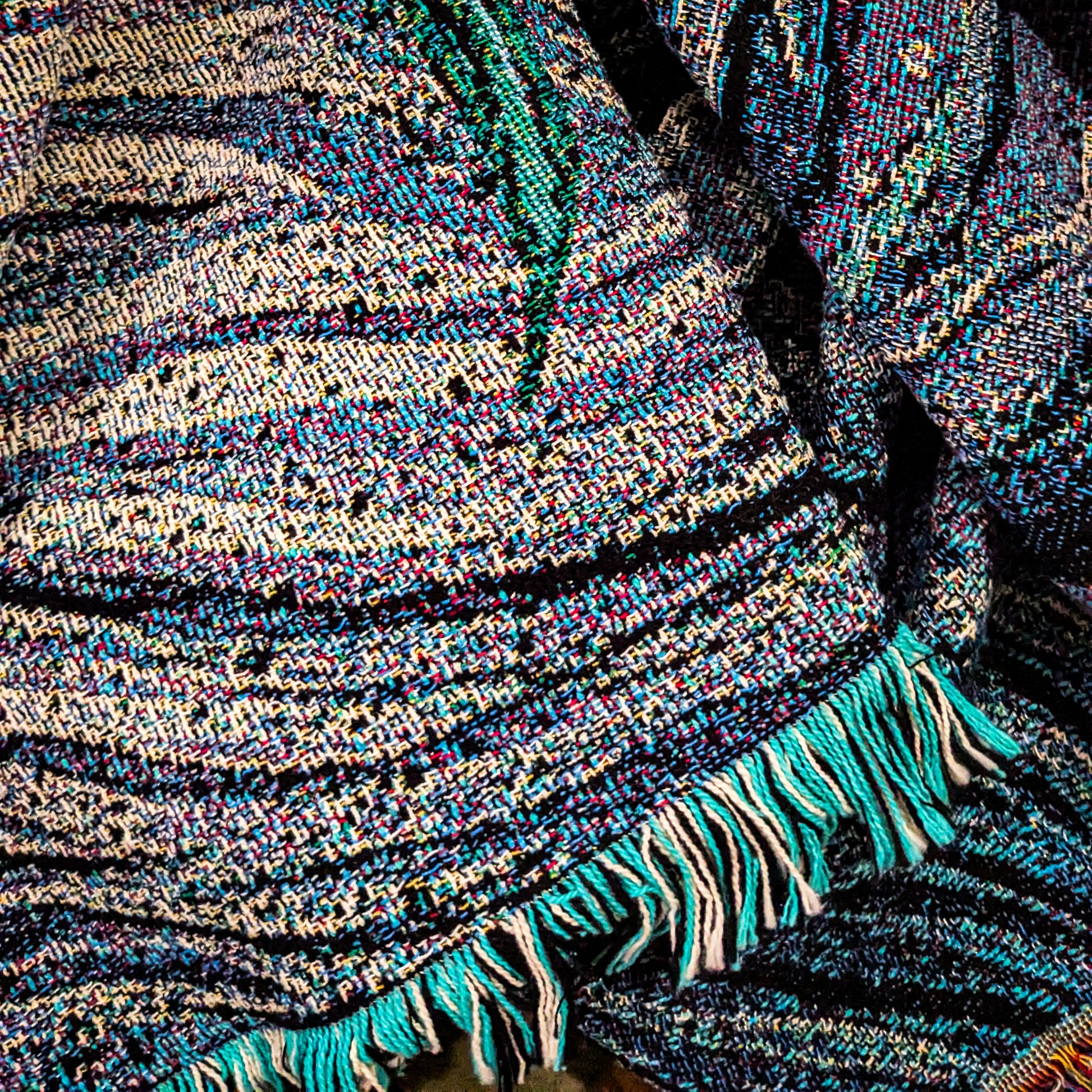 On the edges of the blanket there will be a rainbow on the top/bottom, and a spooky teal, black, & white fringe on the left/right.