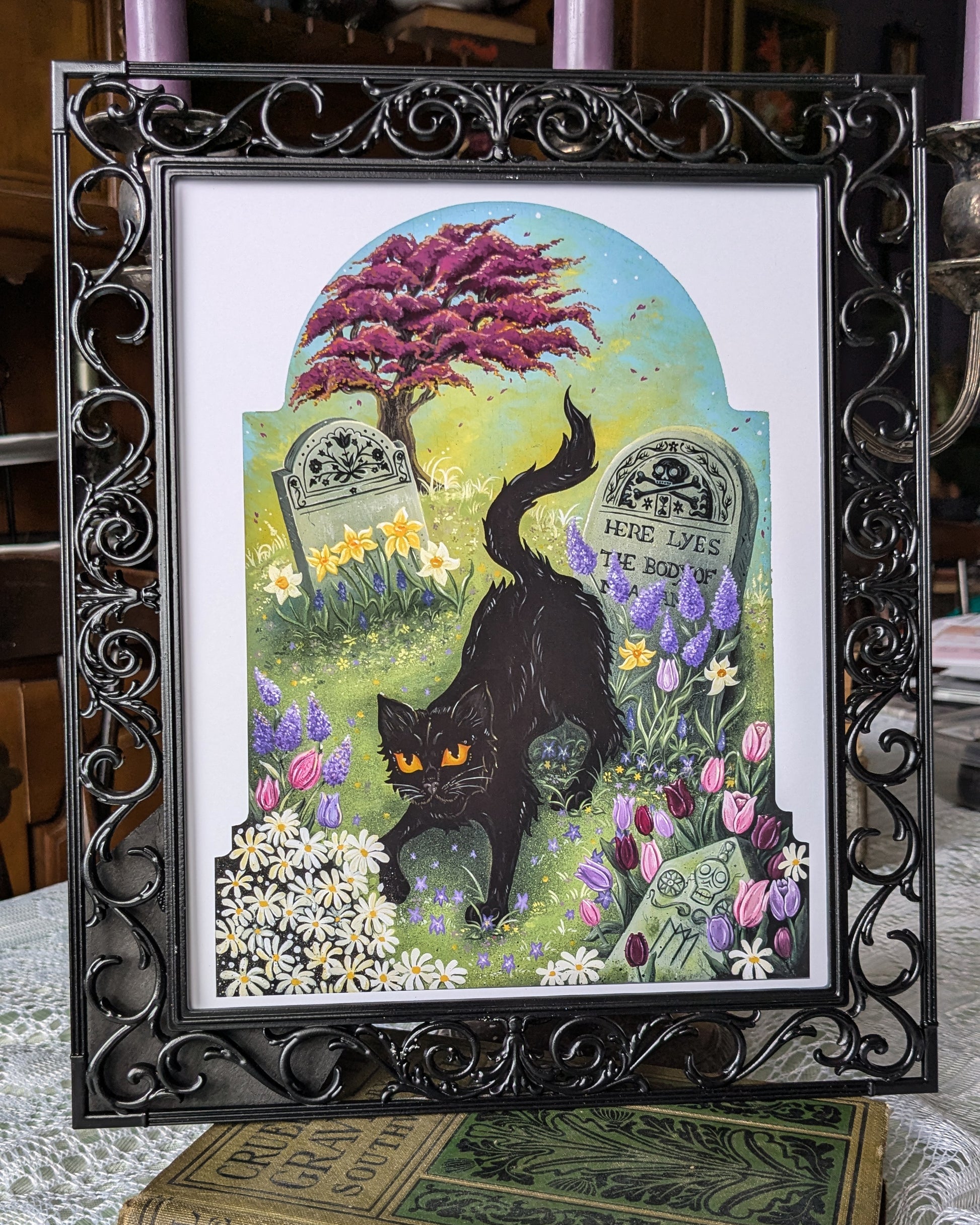 This is a giclee print measures 8" x 10" and is framed in a vintage frame. Features glass, a kickstand for tabletop display, and a hanger on the back.
